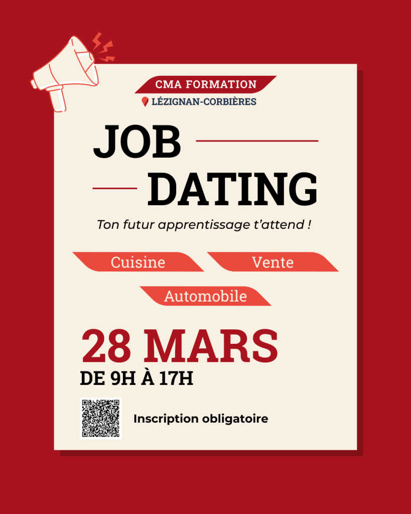 JOB Dating : une journée dédiée pour trouver votre apprentissage ! Le vendredi 28 mars, CMA Formation Lézignan-Corbières organise un Job Dating spécial apprentissage à